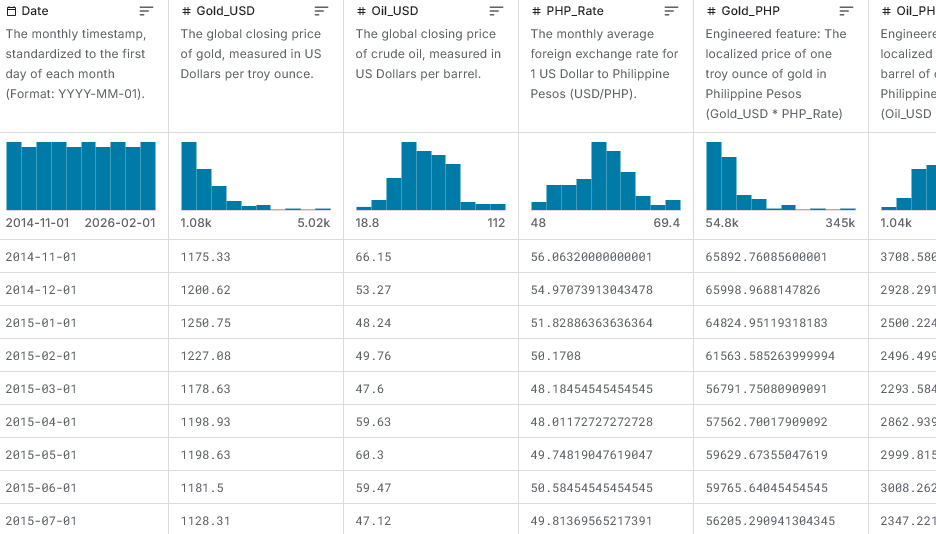 This dataset takes two foundational global assets—Gold (a "safe haven" store of value) and Crude Oil (the ultimate "growth and energy" metric)—and runs them through a localized Southeast Asian lens using the Philippine Peso (PHP) exchange rate.